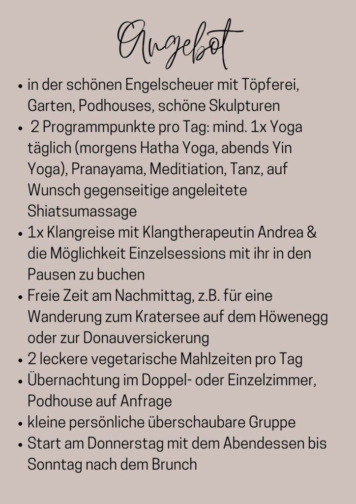 > in der schönen Engelscheuer, Ausgleich Yogawochenende Frühbucher bis 31.1.26: 249€, danach 275€ plus 73€ bis 93€ (pro Tag je nach Zimmerkategorie, zusätzlich noch eine kleine Pauschale für den Seminarraum je nach TN, bitte Zimmer direkt bei der Engelscheuer buchen) für Unterkunft in Einzel-/Doppelzimmer, mit leckerer Verpflegung von Berta mit Liebe gekocht, von den meisten Krankenkassen mit bis zu 150€ bezuschusst